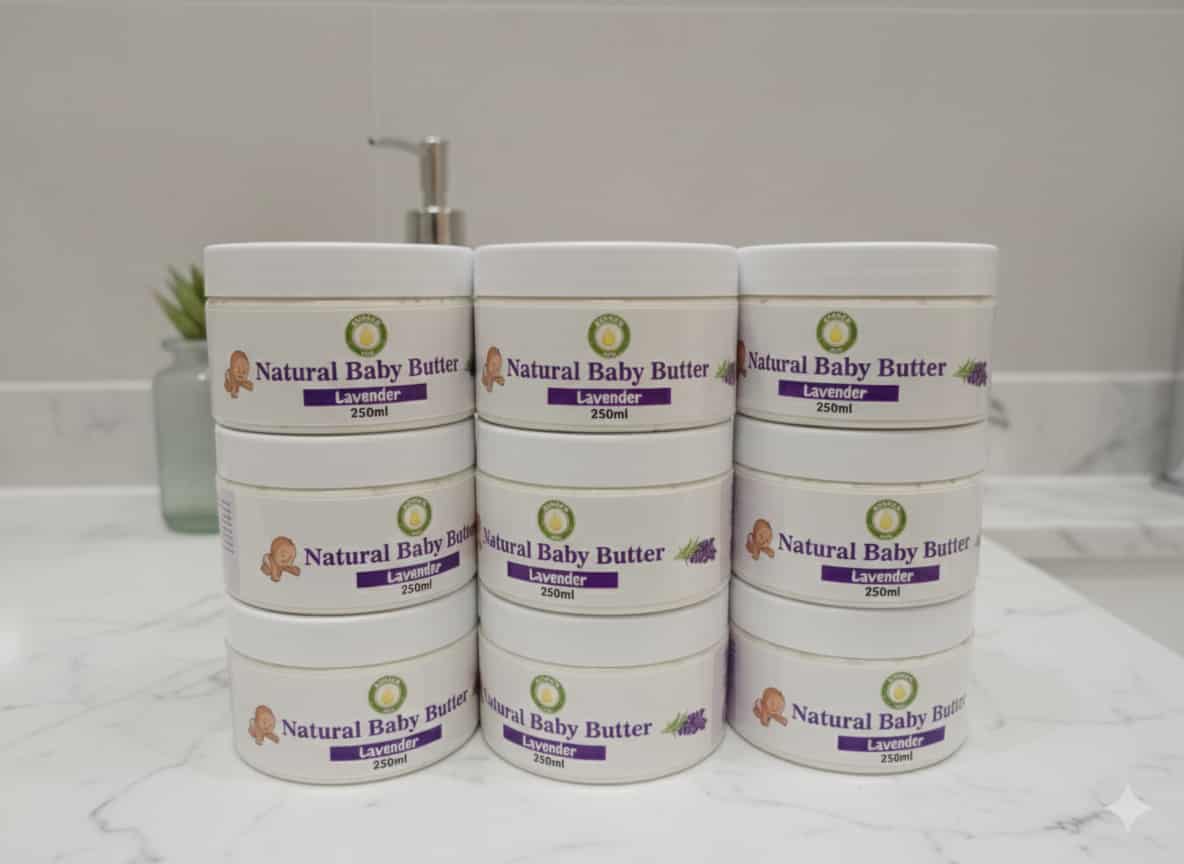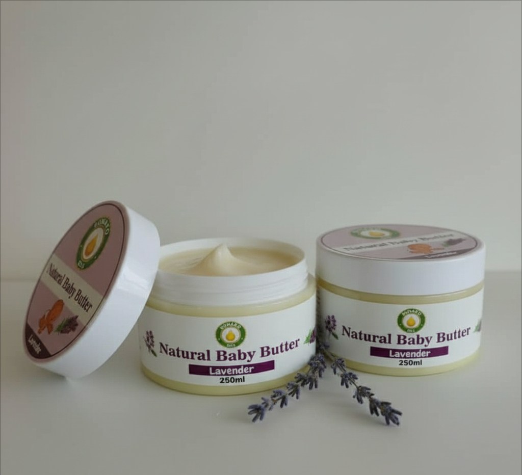 Our Baby Butter is crafted with rich ingredients like shea butter and cocoa butter, and nourishing oils such as jojoba oil, olive oil, sweet almond oil, and lavender oil